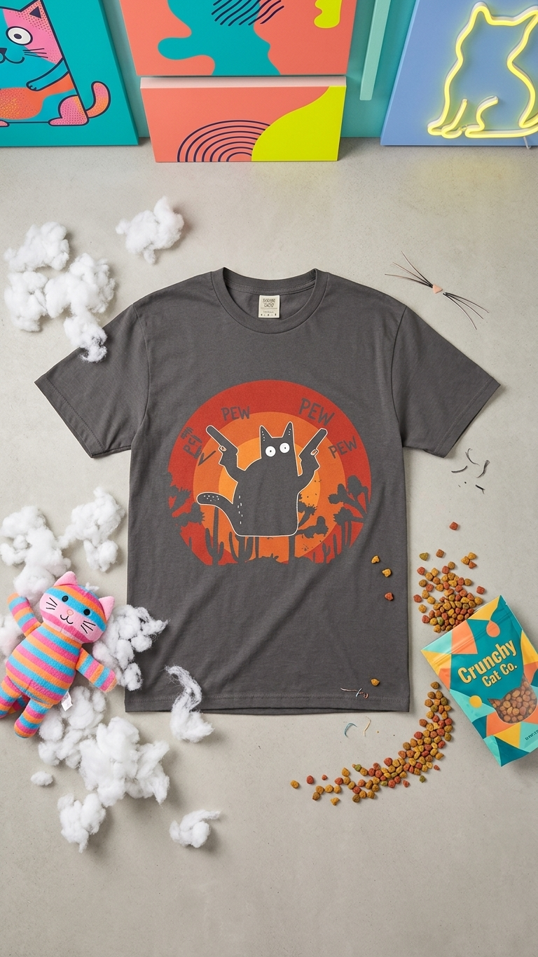 If you adore cats and enjoy lighthearted humor, then the Pew Pew Cat Graphic T-Shirt is the perfect choice for you. It features a cheeky cartoon cat aiming finger guns against a warm desert sunset, which makes it an instant standout in any casual outfit. As a result, you can expect it to spark conversations wherever you go.