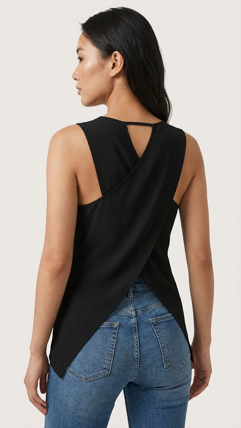 “Chic women’s cross back sleeveless top in soft milk silk blend. Stylish, breathable, and perfect for casual or dressy looks.”